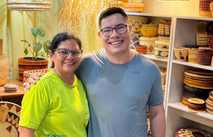 Jornalista Fábio Barbosa durante gravações com a artesã Neida Pereira (Foto: Muruci Produções)